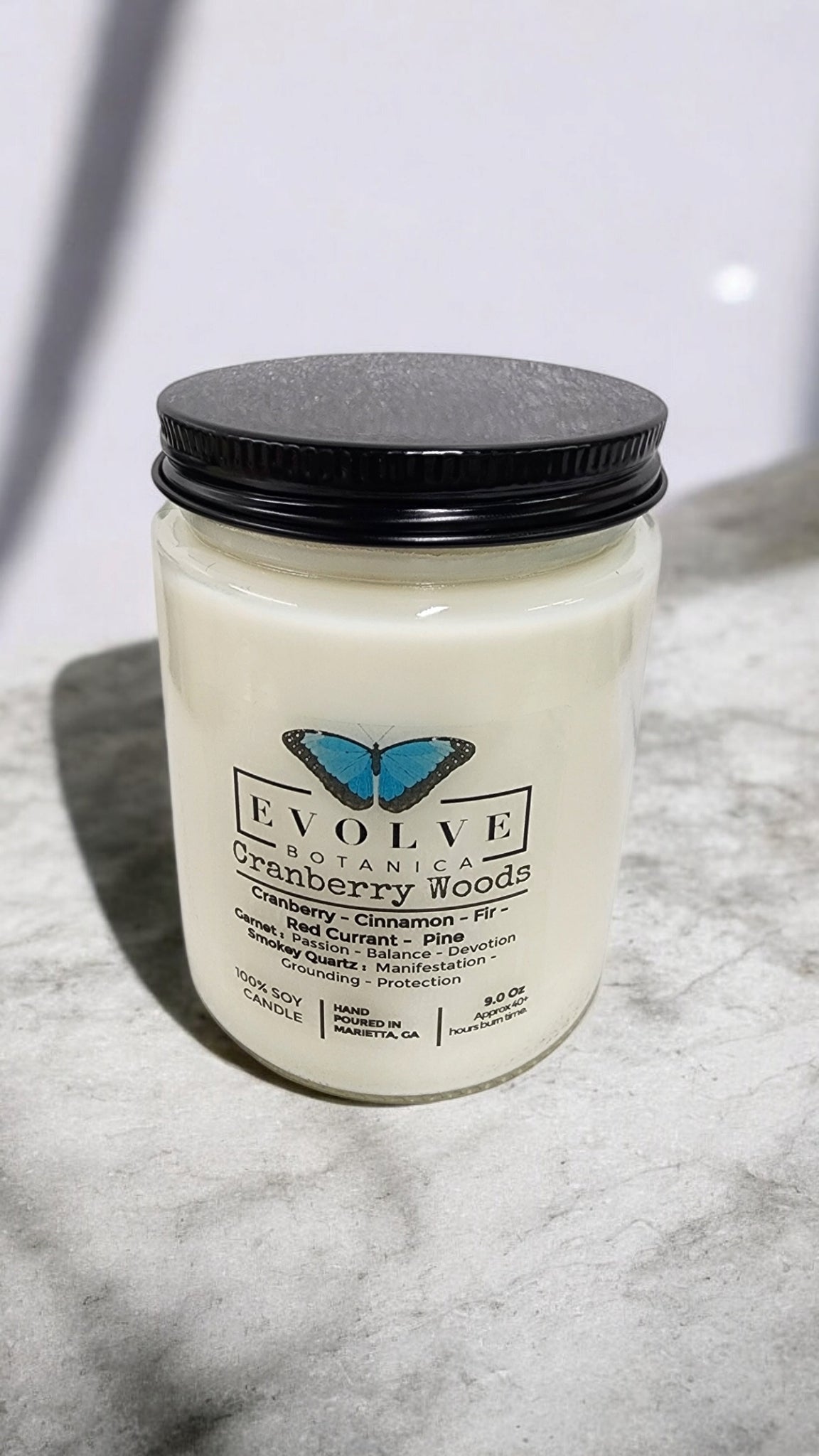 Classic 9oz Jam Jar Crystal Soy Candle - Cranberry Woods (Garnet & Smokey Quartz)
